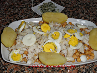 Numa travessa coloque o grão e, por cima, o bacalhau em lascas, os ovos cozidos às rodelas e as batatas cozidas. Regue com bastante azeite.